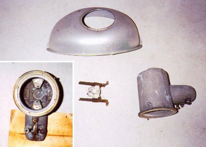 3. The reflector (top of photo) is a single piece of stamped sheet aluminum. This reflector is lacquer coated to reduce corrosion. It is fastened with four small bolts and with washers that act as retaining tabs. There is no glass cover.