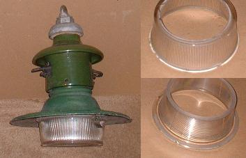 The glass refractor eliminates glare from an exposed filament and is reminiscent of the bucket shaped refractors of today's yard lights. It gives a circular (omnidirectional) light spread. It actually has two concentric glass layers, the inner having horizontal circular ridges and the outer having vertical ribs. Dimensions: 8-1/4" diameter overall at top, 7-1/4" diameter at bottom, 3-1/2" high.