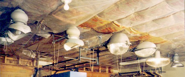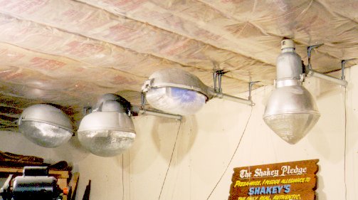 For each luminaire, a section of pipe about two feet long (originally from a fence pole) was rigidly mounted near both ends to a ceiling joist using shelf brackets and chain link fence clamps. Wiring consists of lamp cord, a pull chain switch, and a standard outlet plug. A cylindrical adapter screws into the large (mogul) lamp socket and a standard household lamp screws into the adapter. Incandescent luminaires rated under 200 watts have household lamp sockets (medium screw base) and no adapter is needed.