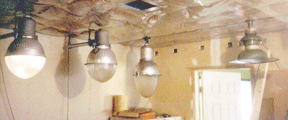 For each luminaire, a section of pipe about two feet long (originally from a fence pole) was rigidly mounted near both ends to a ceiling joist using shelf brackets and chain link fence clamps. Wiring consists of lamp cord, a pull chain switch, and a standard outlet plug. A cylindrical adapter screws into the large (mogul) lamp socket and a standard household lamp screws into the adapter. Incandescent luminaires rated under 200 watts have household lamp sockets (medium screw base) and no adapter is needed.