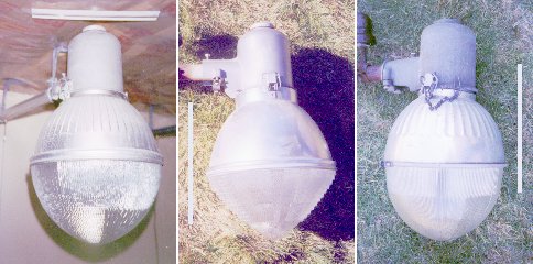 The two GE specimens have Wheeler heads. I am not sure whether they were installed that way or whether an original non-photocontrol head was replaced to change over to individual photocontrol operation. They are depicted without photocontrols since I observed most gumball luminaires years ago without photocontrols.